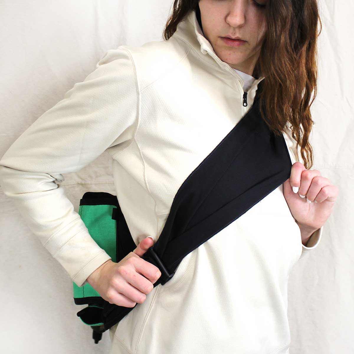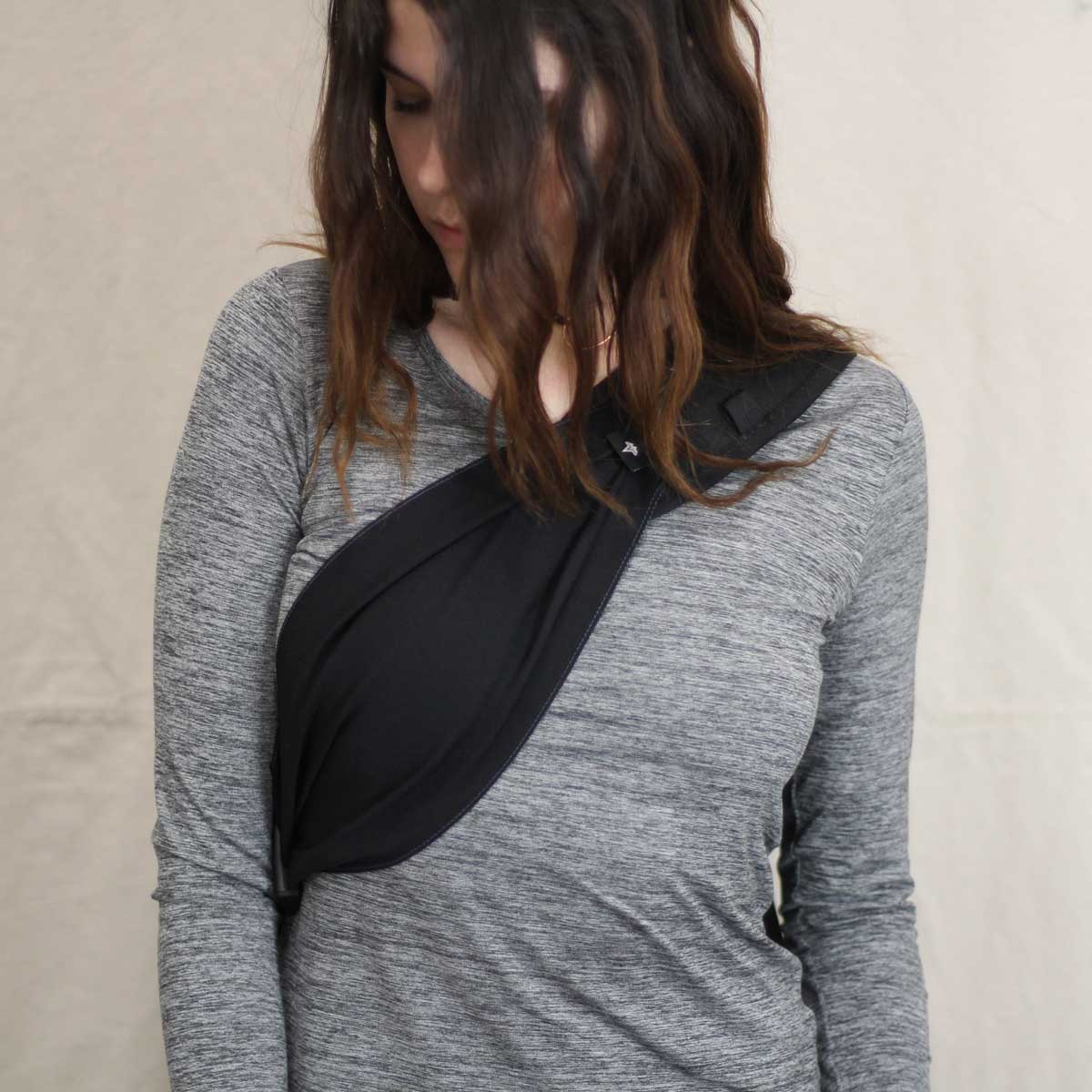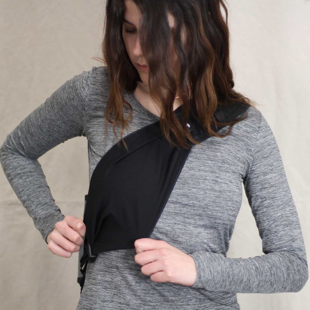 The Damsel Harness is a 4-Way Stretch band that conforms to your natural topography to better distribute weight accross the chest for greater comfort.  A sling pack with this harness was recognized by Field & Stream Magazine as one of the "Top 5 New Products for Women" when released.  It can be added to any sling we make, and is adjusted with a locking cam buckle.